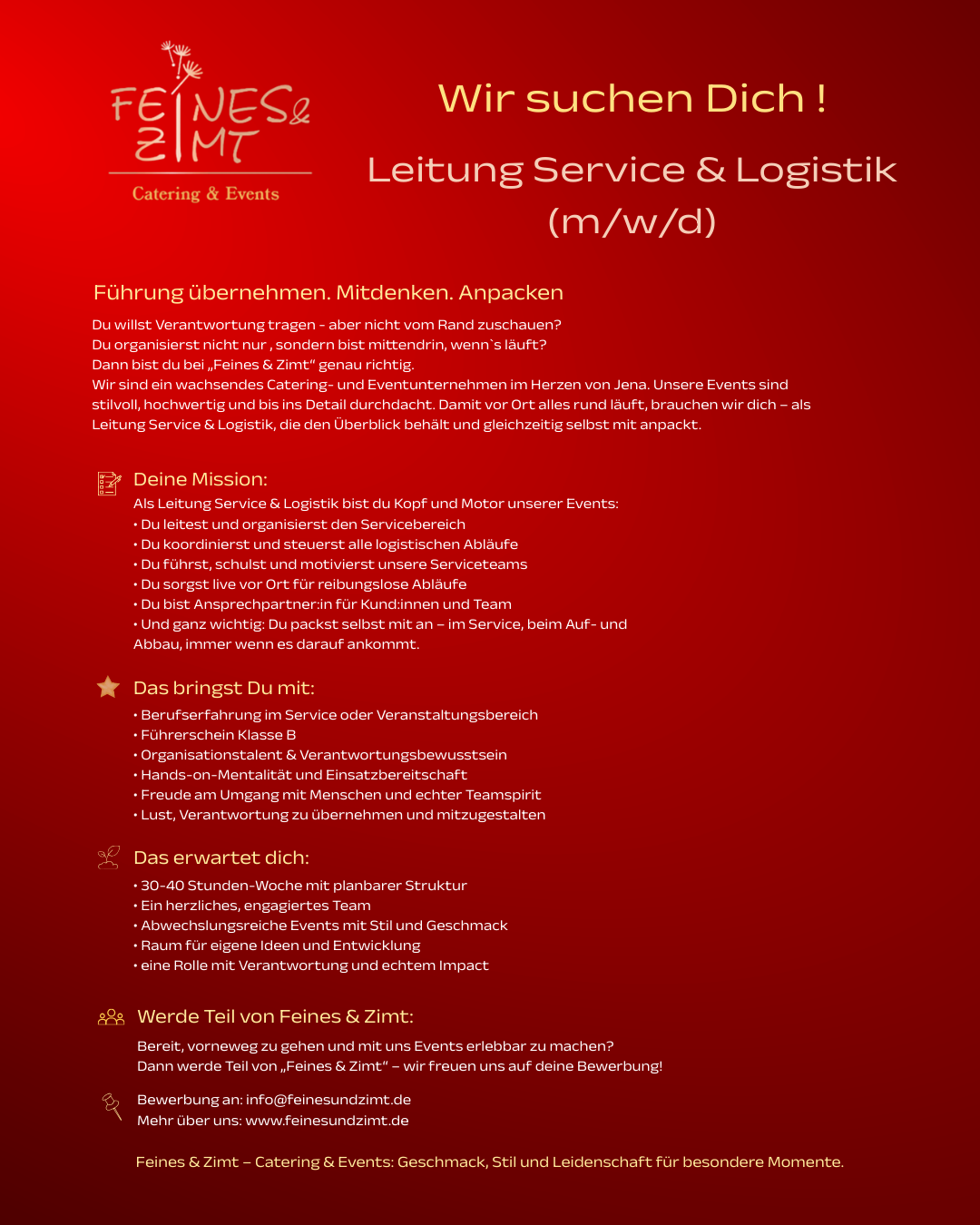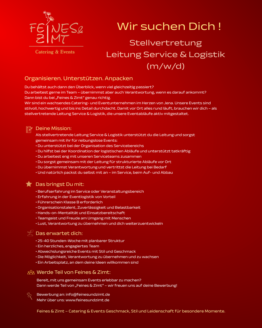 Bei Feines & Zimt dreht sich alles um Gastfreundschaft, Genuss und liebevolle Details. Wir gestalten Veranstaltungen, die Menschen verbinden – und dafür brauchen wir Menschen, die mit Herz dabei sind.